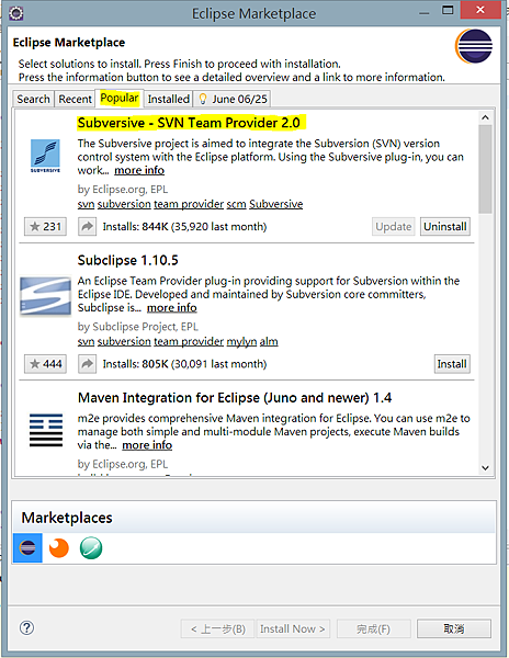 4.在Popular下的Subversive - SVN Team Privider 2.0 點 install 安裝